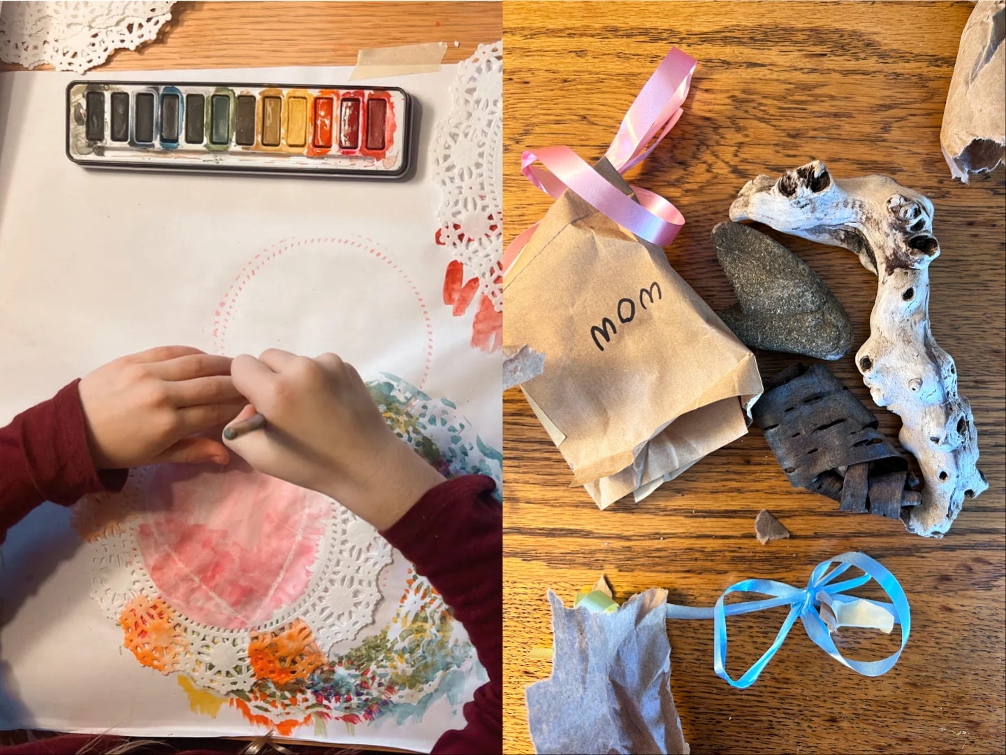 DIY Valentines: Inspired by Rose Pearlman, my daughter and I made batch Valentines for her first grade classmates. We found paper doilies in the craft cupboard (leftover from making snowflakes) and, after some brainstorming, decided to use a white crayon for a watercolor resist effect. The whole project took a couple hours, tops, over the course of a weekend, and required minimal parental involvement. The only thing I did was make the heart stencil. We also showed some love to our favorite beach and met up with friends for a community-wide Valentine’s Day beach clean-up. My daughter wrapped up a few treasures she found on the beach to give as gifts, grains of sand included.
